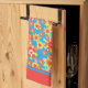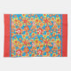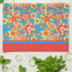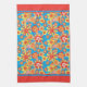 Toalla de cocina de estilo rústico o toalla de té, con un patrón de flores rojas, naranjas y amarillas sobre un fondo turquesa brillante, de un collage de papel pintado a mano de Judy Adamson, con un borde rojo en cada extremo.