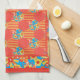 Toalla de cocina de estilo rústico o toalla de té, con un patrón de mosaico de flores rojas, naranjas y amarillas sobre un fondo turquesa brillante, de un collage de papel pintado a mano de Judy Adamson, con puntos de polka blancos sobre un fondo rojo y rayas amarillas, naranjas y rojas.