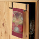 Una cara de gato estilizado hecha de curvas y curvas doradas brillantes, con ojos de oro verde ancho, contra un fondo fractal rojo.