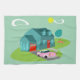 Este patrón retro de toalla de cocina suburbana presenta una típica casa norteamericana en un típico vecindario norteamericano, alrededor de 1950. Una casa verde azulada con un techo azul pavo real y ventanas color turquesa queda perfectamente compensada por una vibrante puerta roja y puerta de garaje. Un clásico coche rosa y descapotable de los años 50 está aparcado en la pintoresca carretera. Los flamencos kitsch, plásticos y rosados se asoman directamente a casa en forma de boomerang de césped verde recién cortado sobre un fondo de jade. El césped artificial del hotel está rodeado de árboles extravagantes. Nubes con forma de judía de riñón y una explosión de sol amarilla te hacen saber que es sólo otro día glorioso en los suburbios modernos de mediados de siglo.