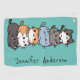 Adorable pila de lindos gatos personalizados kawaii, cada uno apilado uno encima del otro, cada uno con un aspecto y color diferentes. El color de fondo es el tono perfecto del verde azulado. A la derecha de los gatos hay una plantilla con un sencillo tipo de letra para que puedas personalizar este dulce regalo con un nombre o mensaje.