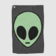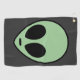 Cabeza simple de alienígena verde con grandes ojos negros y una pequeña boca negra sobre un fondo gris oscuro.