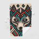 Se trata de una cara decorativa de lobo hecha a mano y estilizada con estampados aztecos en colores negro, rojo, turquesa y beige.