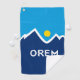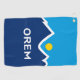 Toalla de golf con un diseño con la bandera de Orem, Utah. Una bandera azul, blanca y amarilla con picos de montaña y el sol en el centro