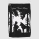 Esta toalla de golf tiene una silueta negra en blanco de capucha roja sentada bajo los árboles en el bosque sosteniendo flores hablando con el lobo. Personalizar el texto con la plantilla.