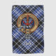 Insignia escudo Clan Clark rodeada por una correa y hebilla sobre el fondo del tartán. Texto personalizado.