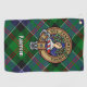 Insignia escudo del clan Paterson rodeada por una correa y hebilla sobre el fondo del tartán. Texto personalizado.