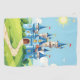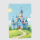 Hermoso castillo azul y blanco con banderas rojas en un día soleado de verano. Esta ilustración caprichosa y hermosa con el sol, nubes, cielo azul y hierba verde en la colina.