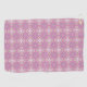 Se muestra un juego de toallas con estampado morado. La imagen superior muestra toallas de baño en una barra, y la imagen inferior muestra un paño de lavado con una esquina doblada.