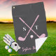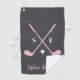 Looking for a stylish personalized golf towel for women that doesn’t get lost or look boring? This chic towel features bright pink golf clubs with white bows, and a crisp white golf ball on an elegant gray background. Customize it with initials and a full name for a polished, personal touch.