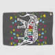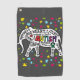 Elefante Autism Awareness Golf Towel Elephant con palabras inspiradoras que apoyan el autismo. Luminosas piezas de rompecabezas en segundo plano. Toalla gris