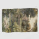 pintura vintage de una escena botánica de cisnes nadando en el agua en un jardín inglés con nenúfares, puentes y muchas flores exóticas