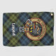 Insignia de Campbell escudo rodeada de una correa y hebilla sobre fondo tartán. Texto personalizado.