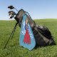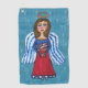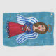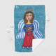 Esta toalla de golf está cubierta de azul en pequeñas estrellas doradas con un ángel patriótico de EEUU con ojos azules y un halo dorado en un vestido rojo blanco y azul con una bandera de EEUU.