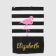 Un flamingo rosa aparece sobre rayas negras y blancas. En la parte inferior, esta toalla de golf se puede personalizar con el nombre del destinatario en un guión falso de oro.
