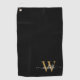 Moderno Monograma Girly Elegante Negro y Oro Nombre inicial Firma Script Personalizado Toalla de Golf Personalizada. Este diseño presenta su primer nombre en una tipografía de tipo de letra de cola de corte con letras de bonito (o caligrafía) con monograma inicial en oro y blanco sobre negro. Son fáciles de personalizar. Gran regalo de cumpleaños femenino elegante, también para el día de la madre, aniversario, boda, despedida de soltera, ducha de novia y es para el chica que ama cosas minimalistas limpias únicas.