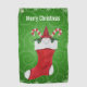 Esta toalla de golf es verde, bordeada de serpentines blancos y de un Navidad rojo y blanco con un bonito gnomo en la parte superior entre los bastones de caramelo y las hojas verdes y huecas con bayas rojas. Personalizar el texto de Feliz Navidad con la plantilla.