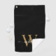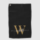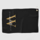 Moderno Monograma Girly Elegante Negro y Oro Nombre inicial Firma Script Personalizado Toalla de Golf Personalizada. Este diseño presenta su primer nombre en una tipografía de tipo de letra de cola de corte con letras de bonito (o caligrafía) con monograma inicial en oro y blanco sobre negro. Son fáciles de personalizar. Gran regalo de cumpleaños femenino elegante, también para el día de la madre, aniversario, boda, despedida de soltera, ducha de novia y es para el chica que ama cosas minimalistas limpias únicas.
