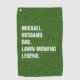 A bold Lawn Mowing Legend golf towel featuring clean white typography set against a realistic grass-textured background.