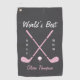 ¿Busca una toalla de golf personalizada y elegante para mujeres que no se pierda ni se vea aburrida? Esta toalla chic presenta palos de golf rosados brillantes con lazos blancos y una bola de golf blanca crujiente sobre un fondo gris elegante. Personalícela con su nombre para un toque personal y pulido.