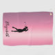 These custom ladies personalized golf towels feature a lady golfer silhouette with a customizable name on a pink metallic look background. It's a stylish, cute gift for a golfer. It's a useful present for your mom, sister, grandma, or any lady whose hobby is playing golf.