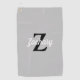 Esta toalla de golf personalizada incluye un nombre de guión retro en blanco y inicial en monograma negro sobre un fondo gris claro.