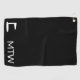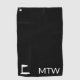 Esta toalla de golf negra tiene texto blanco. Puede cambiar el texto para mostrar el monograma correcto. Una imagen de la bandera de golf está al lado de las iniciales.