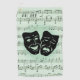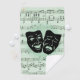 El talento artístico viene en muchas formas y cuando se une es espectacular. Las máscaras teatrales griegas de la comedia y la tragedia yacen sobre una hoja de música