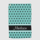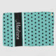 Este diseño tiene un fondo verde azulado claro con puntos de polka negro y rayas verde azuladas y blancas negras. El nombre está en una fuente de script y se puede personalizar mediante el campo de plantilla.
