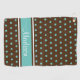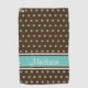 Este diseño tiene un fondo marrón con puntos de polka verde azulados claros y rayas verde azuladas, marrones y blancas. El nombre está en una fuente de script y se puede personalizar mediante el campo de plantilla.