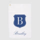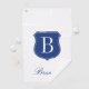 Nombre elegante personalizado con el logotipo de monograma toalla de golf azul y blanca. Regalos de golf monogramados para hombres y mujeres. Plantilla de tipografía de script elegante para nombre y letra inicial. Lujosas ideas de regalo de cumpleaños para golfista, esposo, padre, padre, amigo, compañero de trabajo, jefe, colega, entrenador, instructor, profesor, abuelo, jubilado, etc. Añade tu propio apellido o cita graciosa. Incluyendo gancho para colgarlo. Accesorios de golf únicos para amigos y familia. Diseño elegante de emblemas de escudo. Colores de Personalizable.