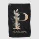 Letra P monograma floral. Letra P en textura marrón dorada acentuada con hojas de compuestos de acuarela verde, flores y polvo de oro. Personalizado con el nombre en el tipo de letra coincidente.