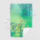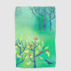 Un moderno y contemporáneo paisaje abstracto en un verde fresco con aves, un erizo y algunos árboles de bosque lejanos. Arte original de Nic Squirrell.