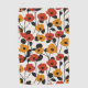 La imagen presenta un vibrante patrón floral con estilizadas flores rojas y naranjas, cada una con audaces centros negros. Las flores están unidas por delgados tallos negros y hojas, todas colocadas sobre un fondo claro. El diseño es minimalista pero llamativo, evocando una estética moderna retro o de mediados de siglo con líneas depuradas y colores contrastantes.