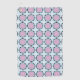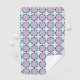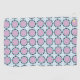 Toallas con un patrón circular rosa sobre un fondo geométrico azul cuelgan de un perchero. Abajo, un paño de aseo a juego está doblado sobre una superficie neutra.