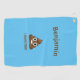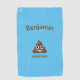 Graciosa toalla de golf emoticono poo con fondo azul. Personalizar con cualquier nombre o texto corto.
