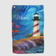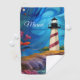 Hermoso faro de rayas rojas y blancas sobre un rocoso en el exterior rodeado de flores y agua azul/cielo Arte de IA creado por minx267