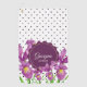 Basado en mi ilustracion acuarela de iris morado con sus pétalos multicolor, morado en la parte exterior y amarillo en el centro, con finos detalles de los pétalos y follaje. El producto tiene un patrón de puntos de polka blanco y negro de moda en el fondo. Personalizar en mi tienda por un diseño personalizado.