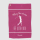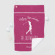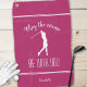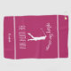 Esta toalla de golf linda y moderna presenta la cita "¡Que el campo esté contigo!" con la silueta de una golfista en blanco sobre un fondo rosa chic con bordes de acento dobles blancos. Una plantilla personalizable le permite agregar un nombre, iniciales o una línea corta de texto.