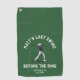 ¡Despegue con estilo con esta toalla de golf de despedida de soltero "Último swing antes del anillo"! Un diseño fresco y moderno perfecto para el grupo del novio en el campo de golf. Personalice para un toque personal y un viaje de golf legendario.