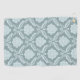 A vintage style decorative damask surface pattern influenced by rococo classical design in duck egg blue color detail on a teal background.
