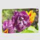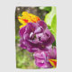 Tulipanes de lilas brillantes en un día soleado en el jardín. La foto fue tomada en junio de 2022. El poster es adecuado para la decoración interior.