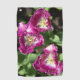 Tulipanes morados y amarillos en un día soleado en el jardín. La foto fue tomada en junio de 2022. El poster es adecuado para la decoración interior.