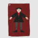 Esta impresionante toalla de golf muestra una imagen de arte digital de un estúpido pero lindo Vampiro de Halloween. El vampiro tiene el pelo negro puntiagudo, una camisa roja y una chaqueta negra con los botones en forma de corazón rojo sanguíneo. Tiene una sonrisa espeluznante y largos colmillos blancos. También tiene uñas amarillas, calcetines morados y zapatos negros con hebillas de oro sobre ellas. Sus brazos están abiertos dándote la bienvenida a un abrazo malvado.