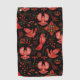 Vibrant red birds with detailed patterns are set against a black background, surrounded by intricate floral and leafy designs, creating a lively, ornamental scene.
