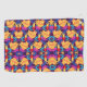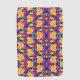 Vibrant geometric pattern features orange flowers and multicolored shapes on a deep purple background. Two perspectives: vertical and horizontal.