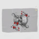 Esta toalla deportiva tiene un boceto a lápiz de un cráneo con remolinos saliendo de él y rosales rojos recorriendo sus alrededores.