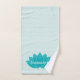 Toalla de mano de sudor con temática de yoga hecha en el huevo azul de robin con un pequeño patrón de puntos de polka blanco. Un extremo de la toalla tiene una silueta de loto azul acuático con texto blanco personalizado a lo largo de la lectura de Namaste. Personalice el texto en blanco para leer lo que desee.