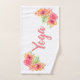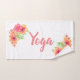 Toalla de mano con temática de yoga hecha en blanco con dos esquinas decoradas con flores tropicales de naranja y coral. El texto en coral, en el medio de la toalla de mano, dice Yoga.
