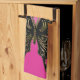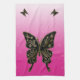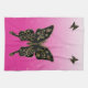 Impresión de una mariposa grande de color negro y oro y dos más pequeñas en la parte superior de cada lado sobre un fondo degradado rosa.